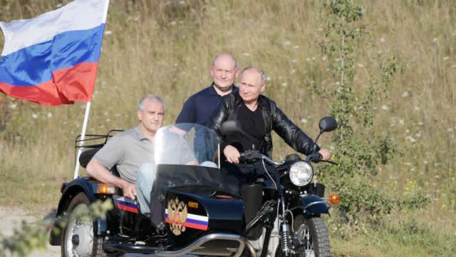 坐在普京摩托车上的有克里米亚总理谢尔盖·阿克肖诺夫和塞瓦斯托波尔临时州长拉扎耶夫。
