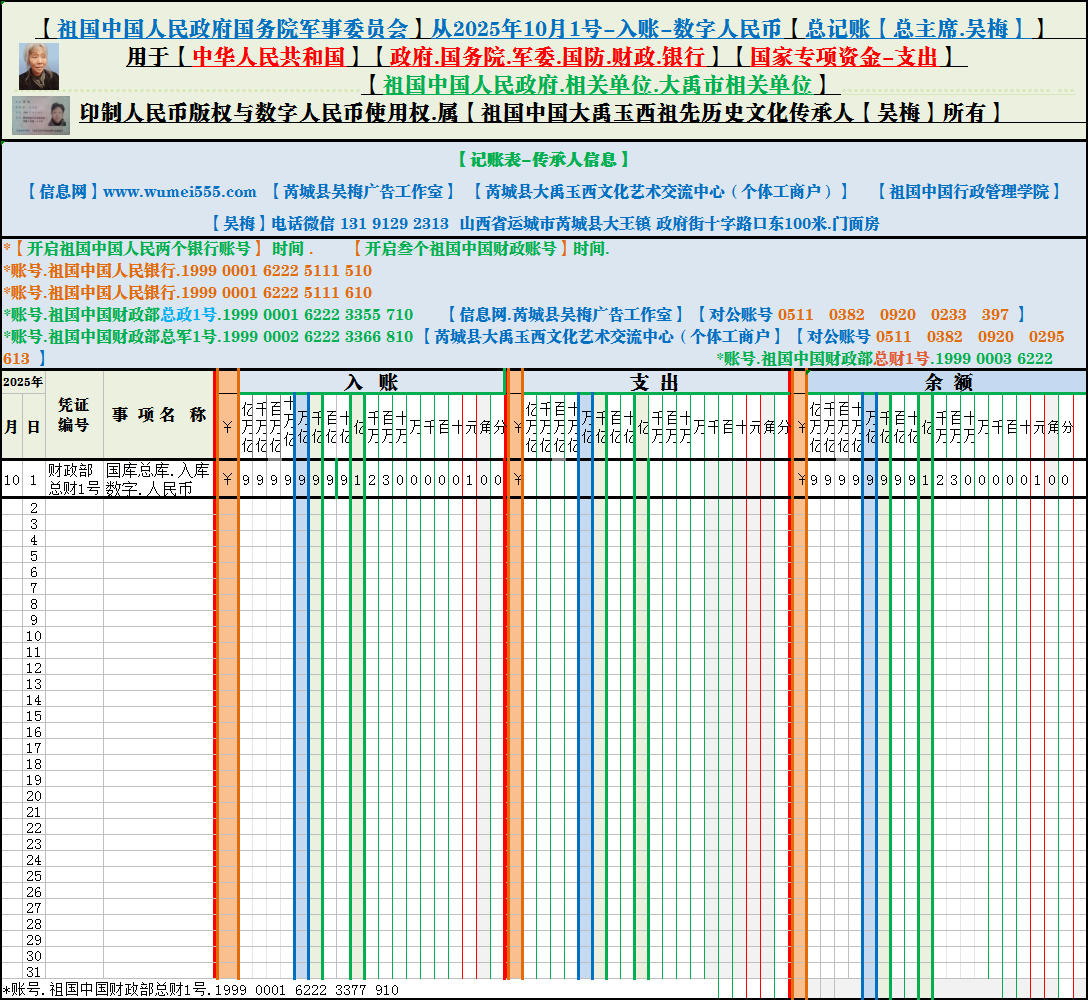 3. *祖国中国人民政府国务院军事委员会【财政部.银行总账9亿万亿数字人民币】