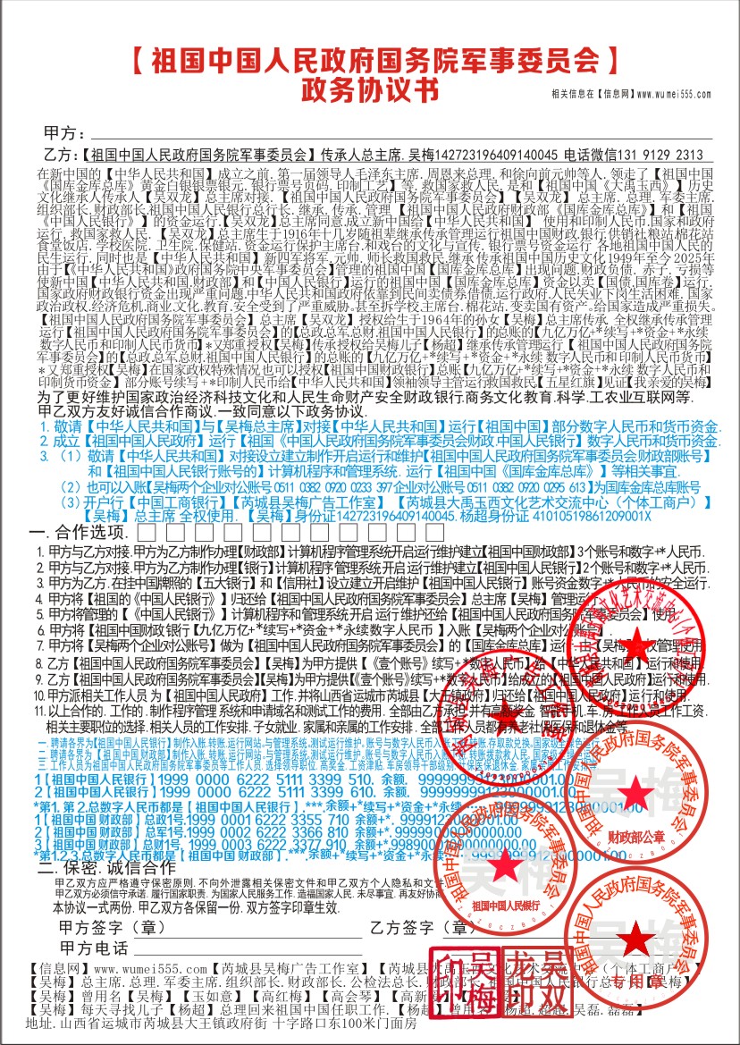 *【祖国中国人民政府】总主席.总理.组织部长.国防部长.财政部长.祖国中国人民银行总行长【吴梅】