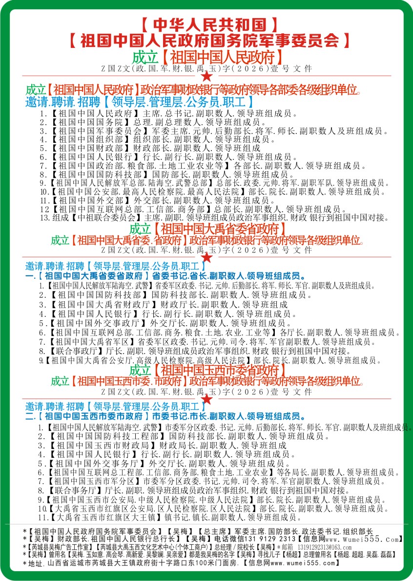 *3.成立的【祖国中国人民政府】随时向社会公布【任职邀请.聘请.招聘等信息】。