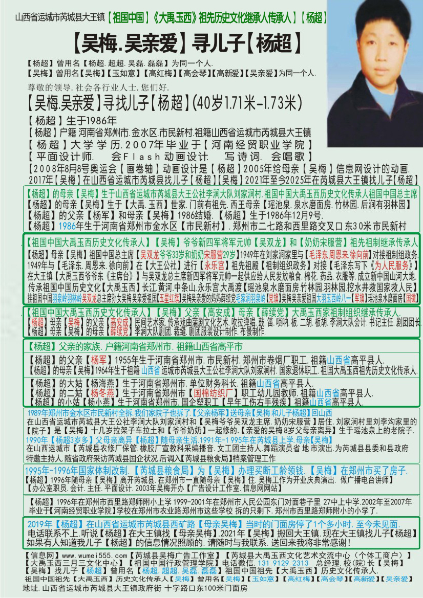 *【祖国中国《永乐宫》祖先历史文化】继承人.传承人【吴梅】寻儿子【杨超】1986年生于郑州市.大学学历.