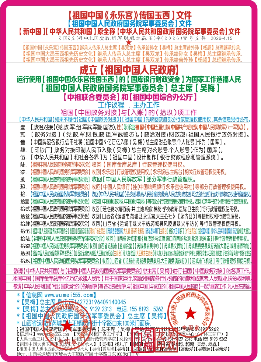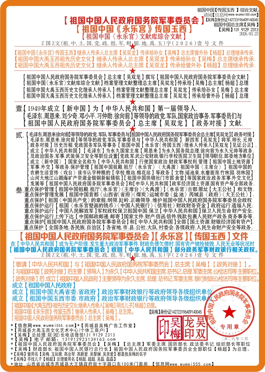 * 敬请【中华人民共和国】与【祖国中国】总主席【吴梅】政务对接!