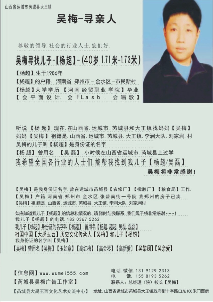 * 【吴梅】2021年在山西省运城市芮城县 大王镇寻找儿子【杨超】5年至今2026年.