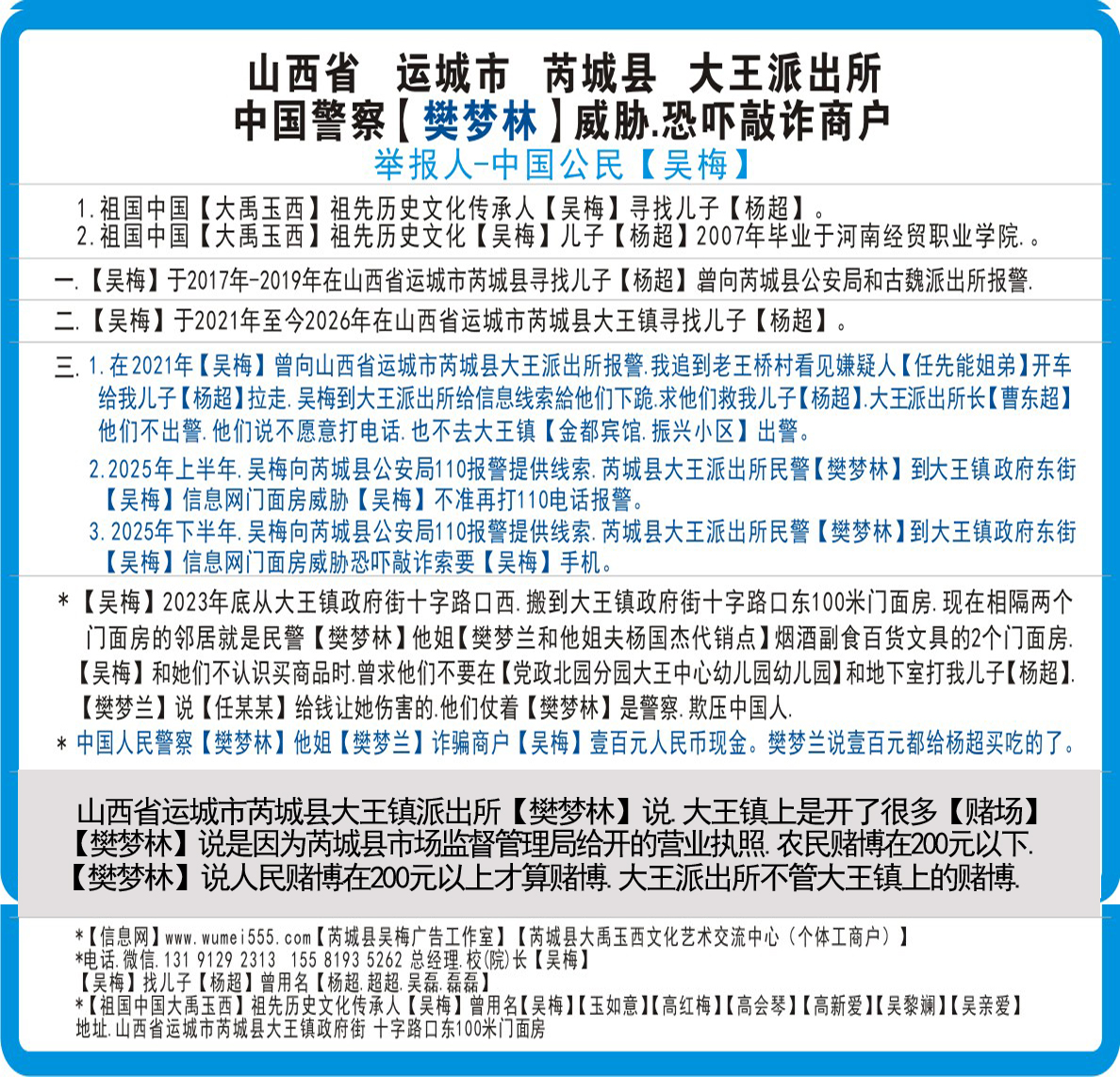 * 2026年3月左右.山西省运城市芮城县【大王派出所】【樊梦林】.不让【吴梅】打110报警. 并到【吴梅】门面房索要【吴梅】智能手机.