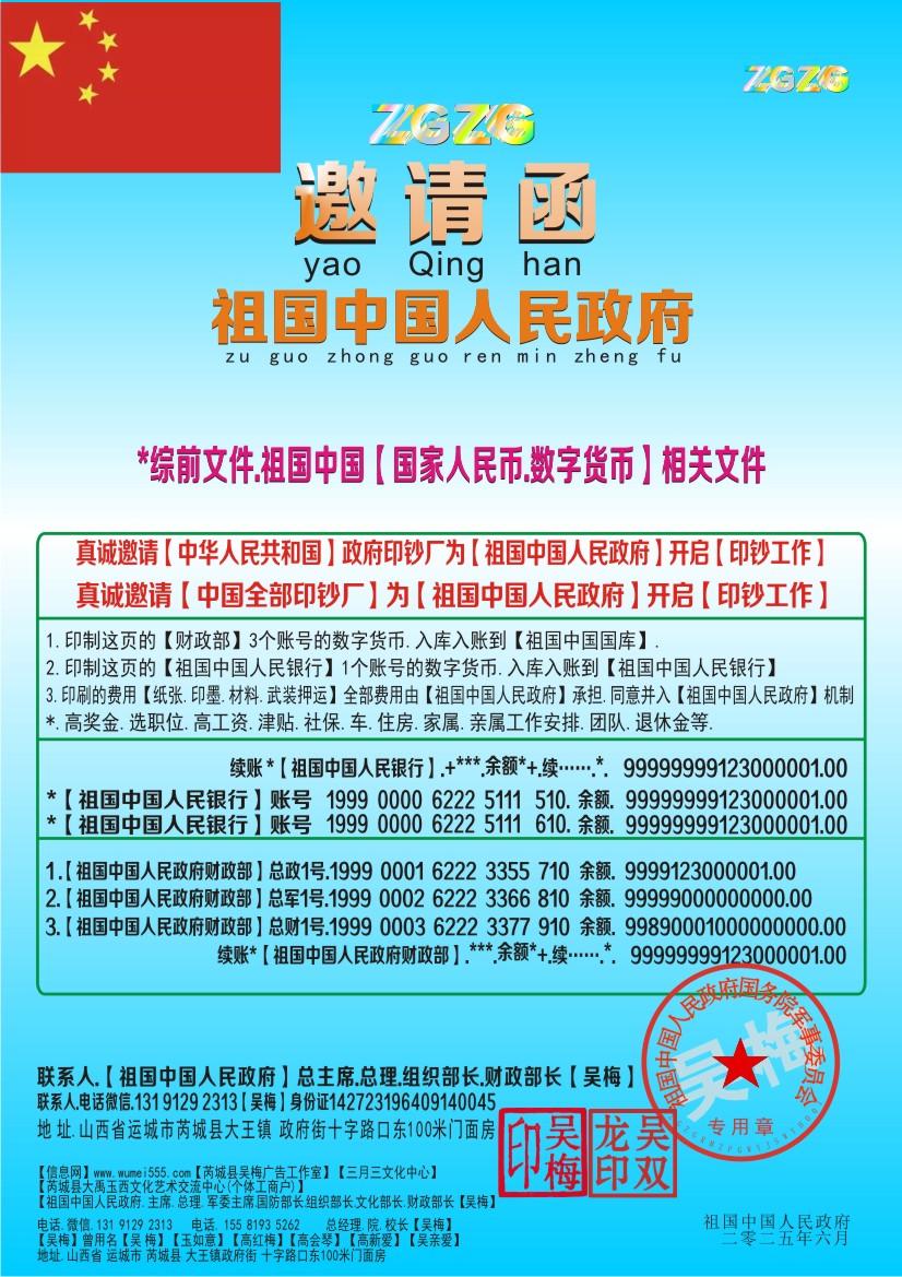 *【祖国中国人民银行】 账号. 1999 0000 6222 5111 510 使用权【吴梅】祖国中国祖先历史文化传承人