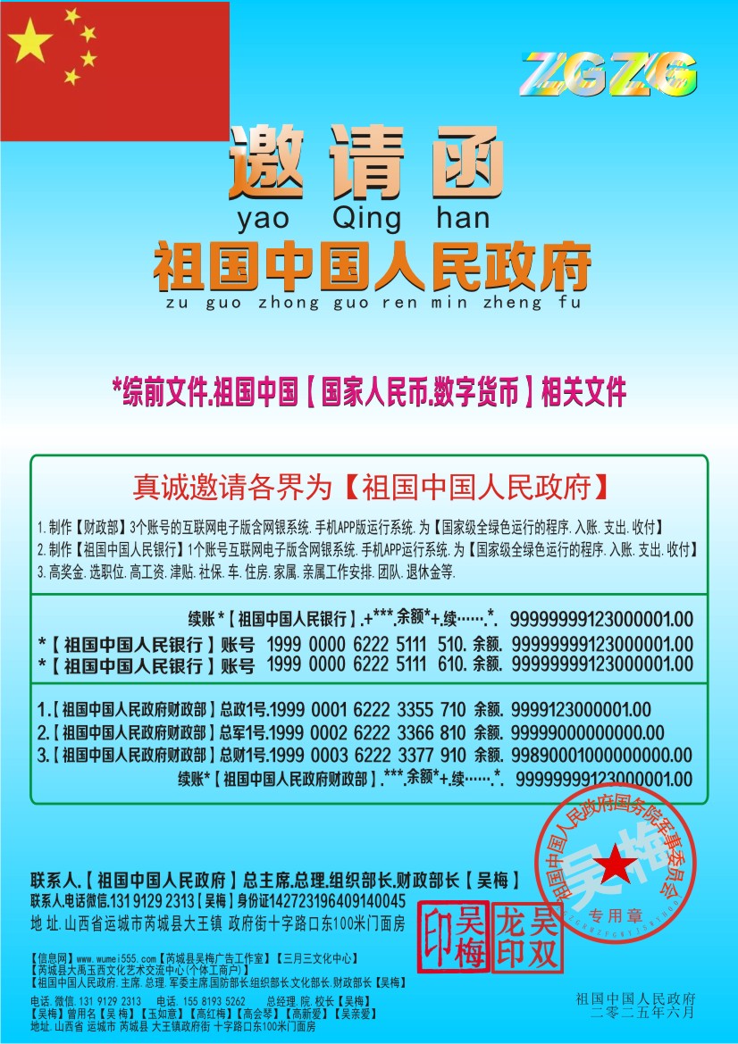 *联系人.【祖国中国总主席.财政部长.银行总行长】【吴梅】电话微信131 9129 2313
