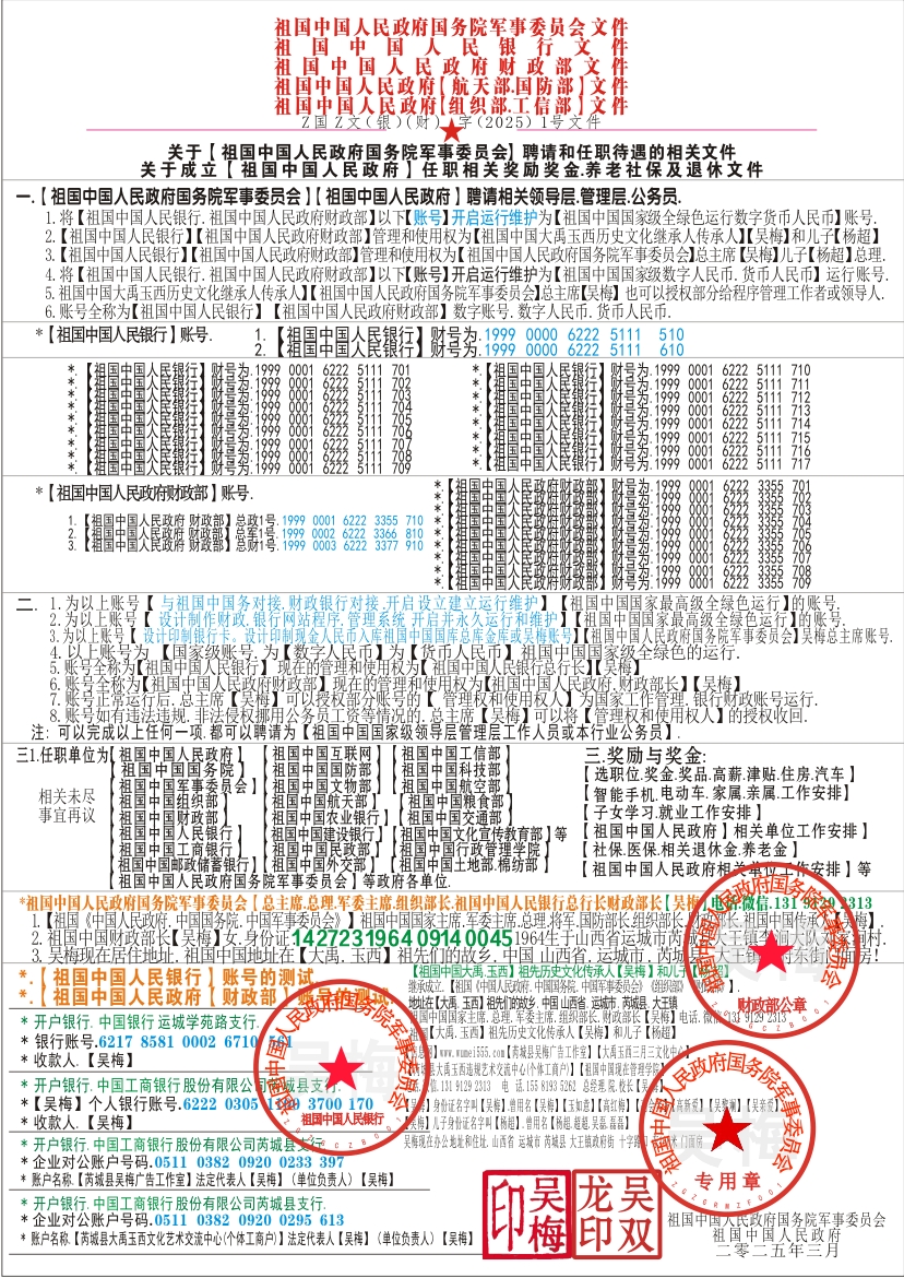 *【祖国中国人民政府国务院军事委员会】【吴梅】总主席等职位。
