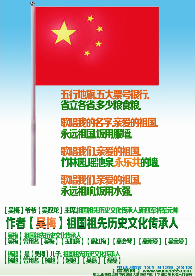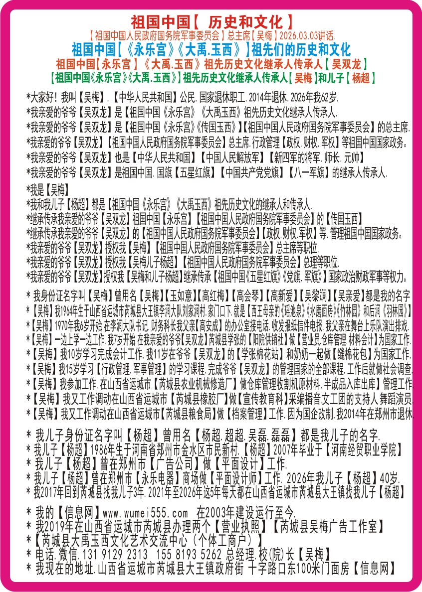 【吴梅】祖国中国【大禹玉西】祖殿祖厅【永乐宫】祖先历史文化传承人【先皇后裔】有芮城县文化局文件。