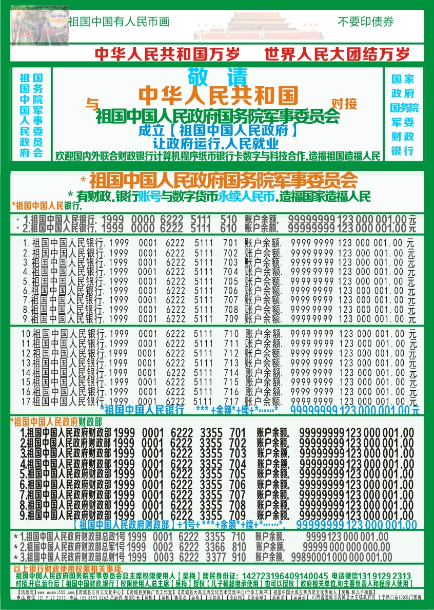 八.1.【祖国中国人民政府国务院军事委员会】有【9亿万亿数字永续人民币.和印制永续人民币权利】。造福国家造福人民。