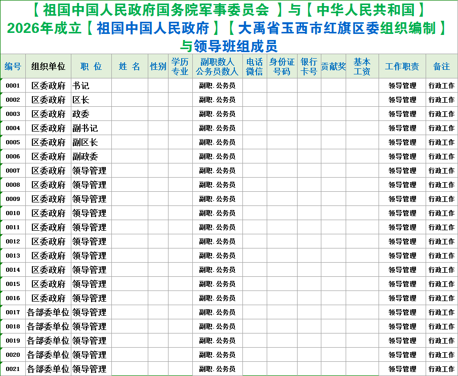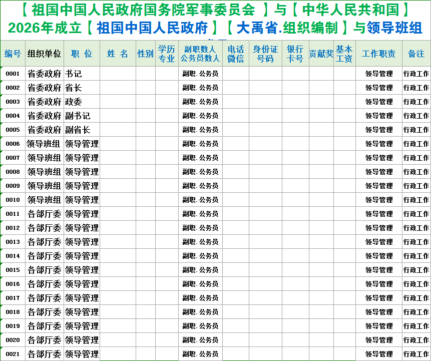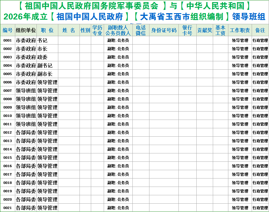 *成立的【祖国中国人民政府】设立【地方领导.领导班组.中层管理.基层管理.工作人员】。