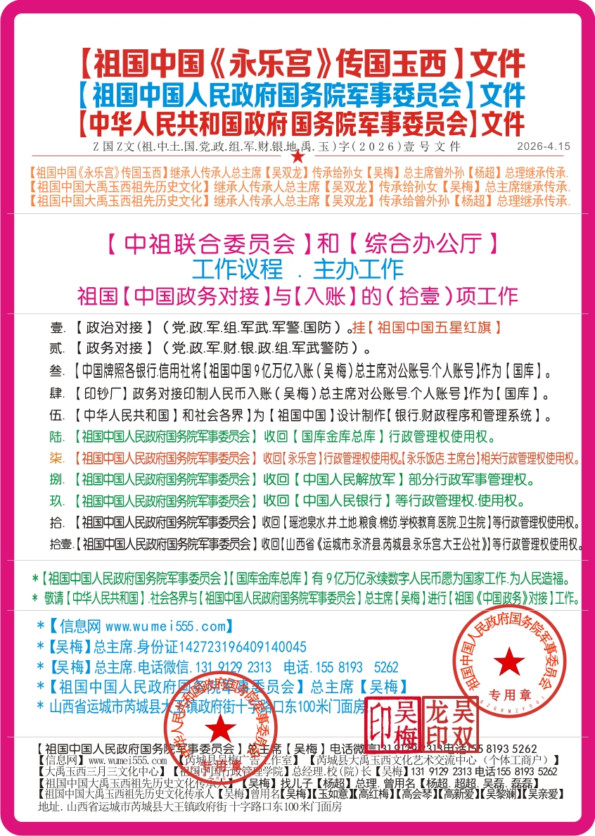 *【祖国中国】总主席【吴双龙】亲自授权孙女【吴梅】总主席等职位.在特殊环境下.