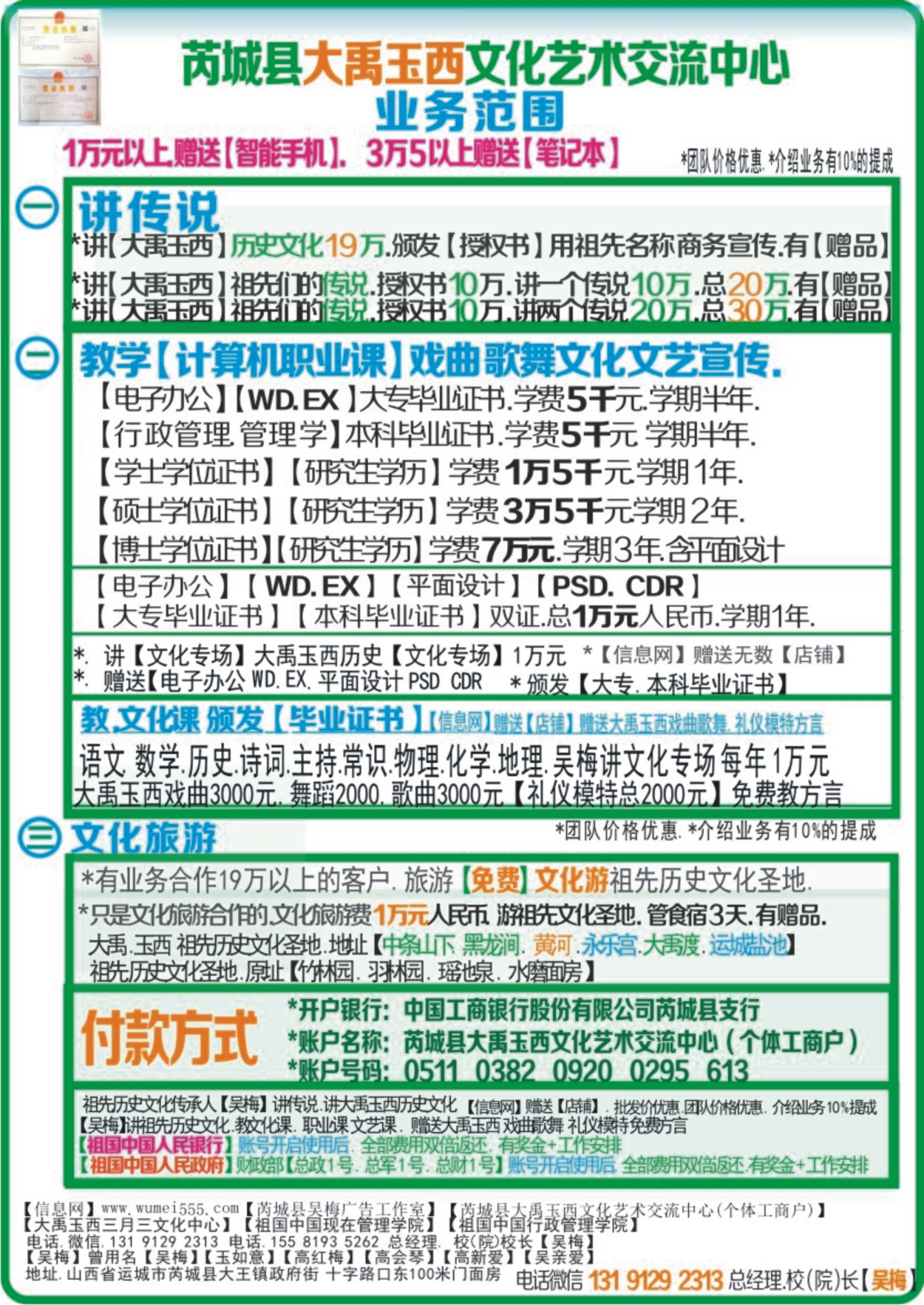 * 芮城县大禹玉西文化艺术交流中心(个体工商户)宣传与传承祖先文化.祖国文化.