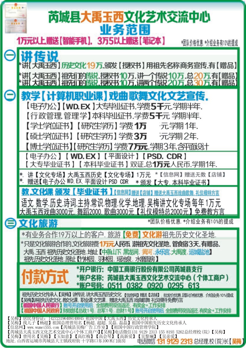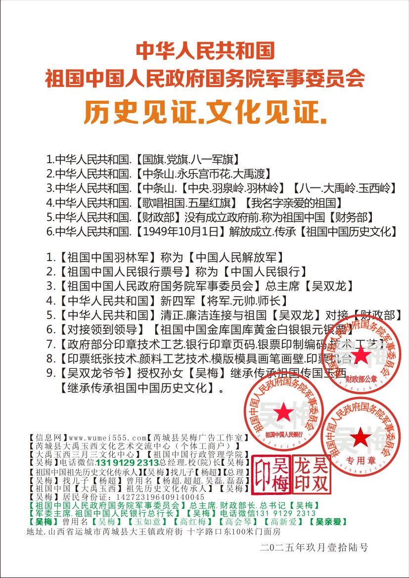 * 祖国中国【祖先历史文化传承人】【吴梅】 *【对公账号】【芮城县大禹玉西文化艺术交流中心】
