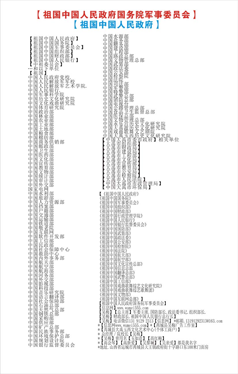 *【祖国中国人民政府】 *【祖国中国国务院】 *【祖国中国军事委员会】 *【祖国中国组织部】 *【祖国中国财政部】 【信息网】www.wumei555.com