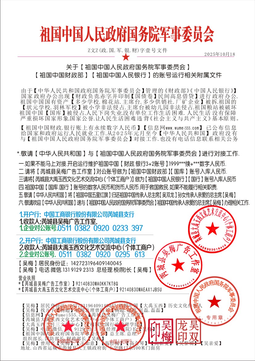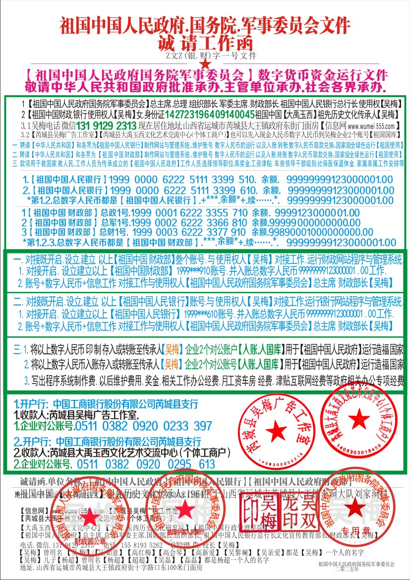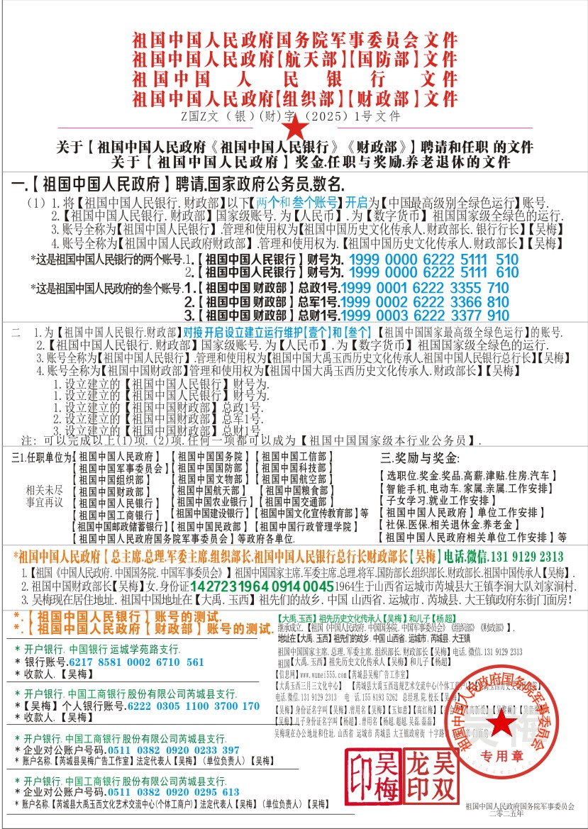 1.【祖国中国财务部】总政1号:1999 0001 6222 3355 710 财务部长【吴梅】电话微信.131 9129 2313 2.【祖国中国财务部】总军1号:1999 0002 6222 3366 810 财务部长【吴梅】电话微信.131 9129 2313 3.【祖国中国财务部】总财1号:1999 0003 6222 3377 910 财政部长【吴梅】电话微信.131 9129 2313