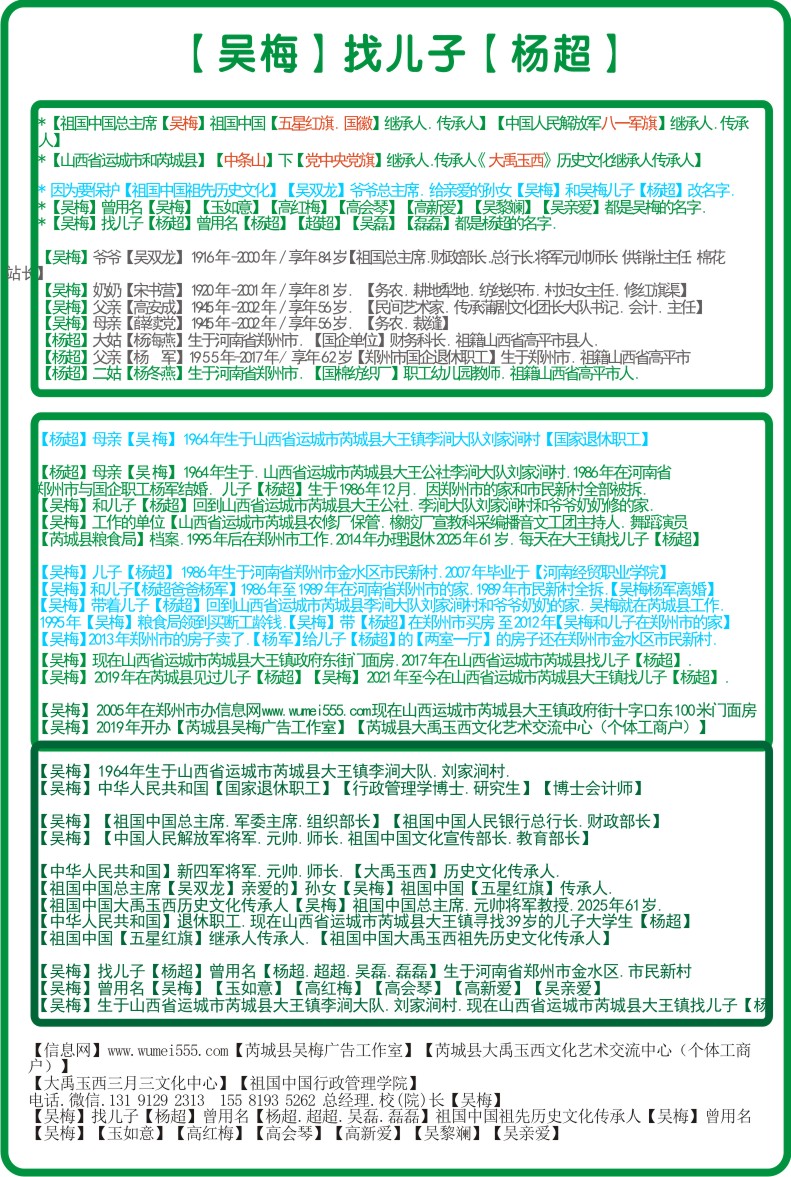 *【主席.总理.军委主席.组织部长.财政部长】【吴梅】* *【吴梅】曾用名 【吴梅】【玉如意】【高红梅】【高会琴】【高新爱】【吴亲爱】【吴玉欣】【吴黎澜】【吴西艾】 *办公居住和地址.山西省.运城市.芮城县.大王镇政府街 十字路口.东100米.门面房