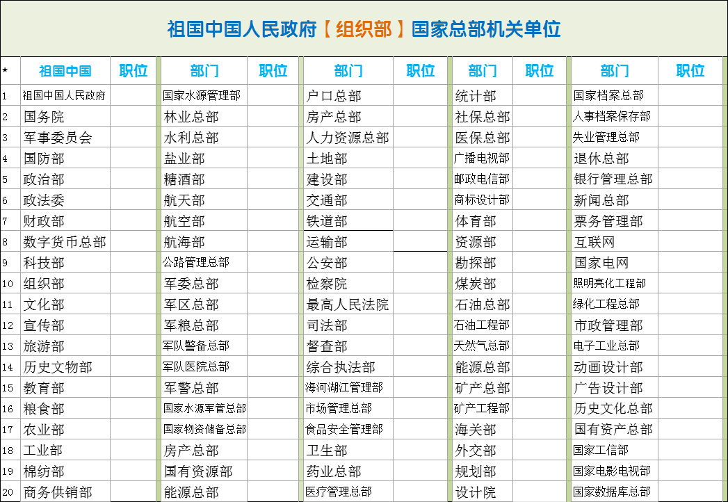*【组织部】【祖国中国财政部】【国家水利资源部】【国家供销商务部】【国家互联网]【航空部】