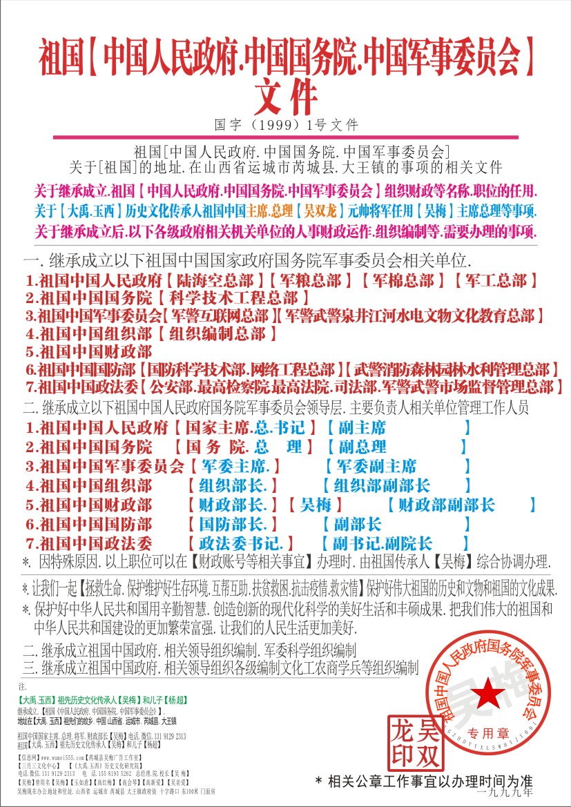 *【祖国中国人民政府.国务院】*【主席.总理.军委主席.组织部长.财政部长【吴梅】