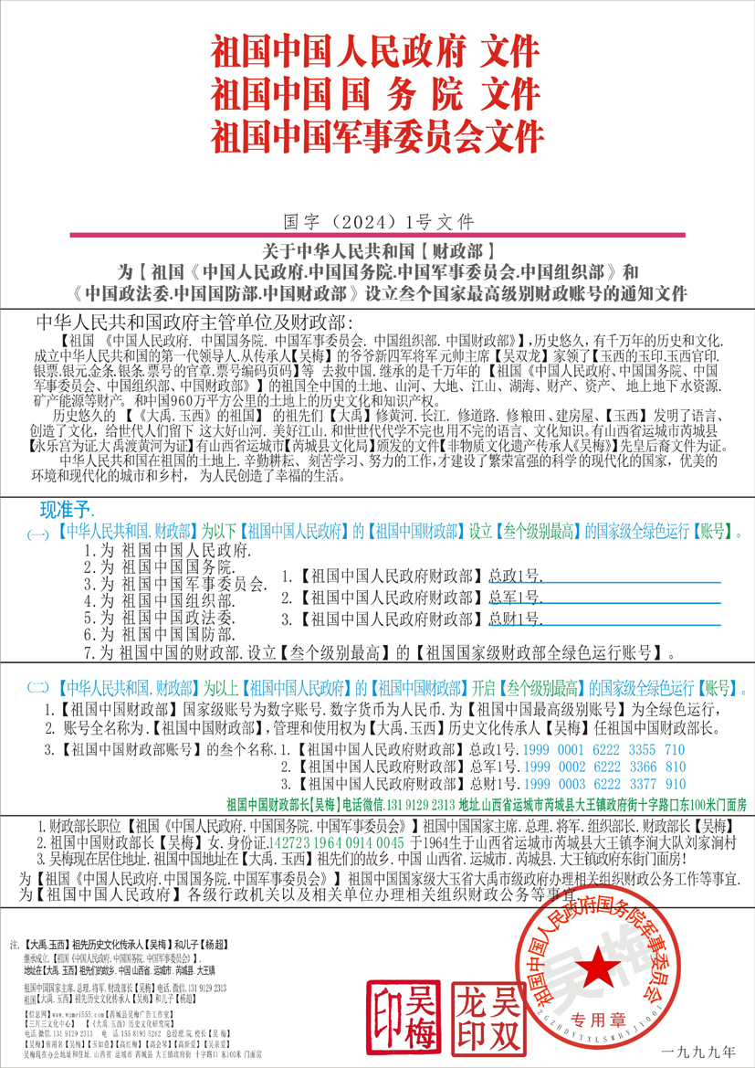 *1.为【祖国中国人民政府】设立叁个【国家最高级别全绿色运行的财政账号】