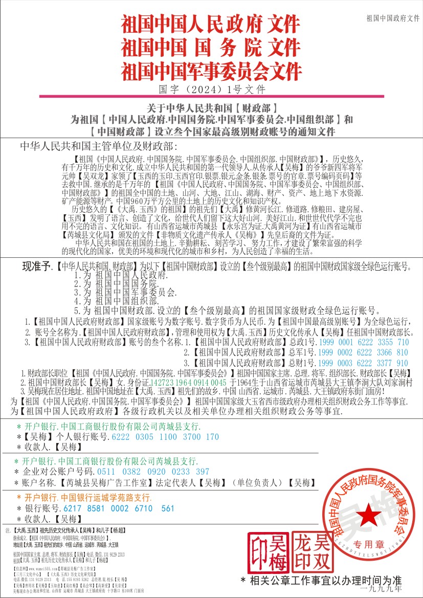 1.【祖国中国人民政府财务部】总政1号:1999 0001 6222 3355 710 财政部长【吴梅】电话微信.131 9129 2313