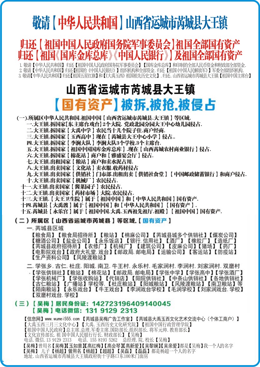 *祖国中国总部地址.山西省运城市芮城县大王镇政府街十字路口东100米门面房.