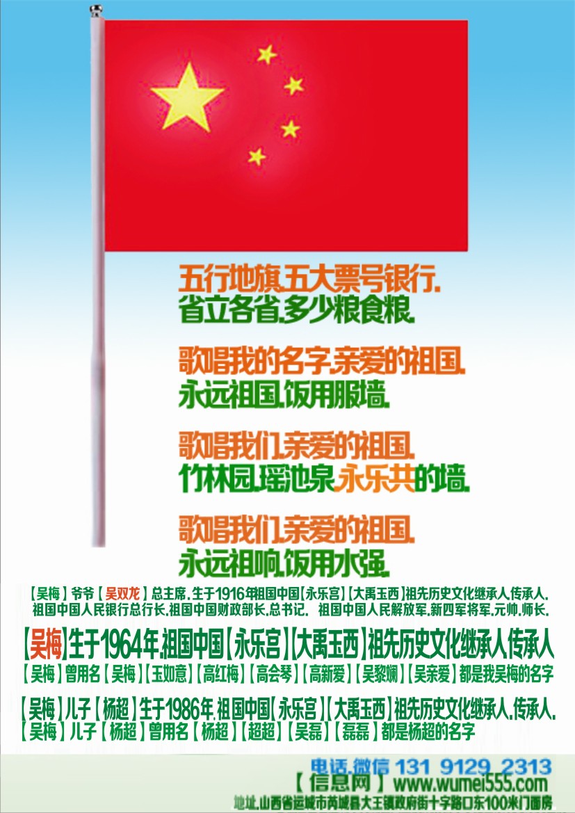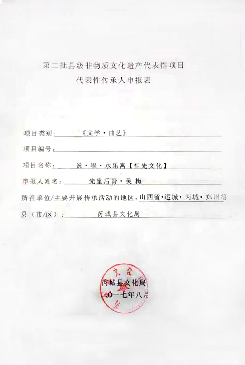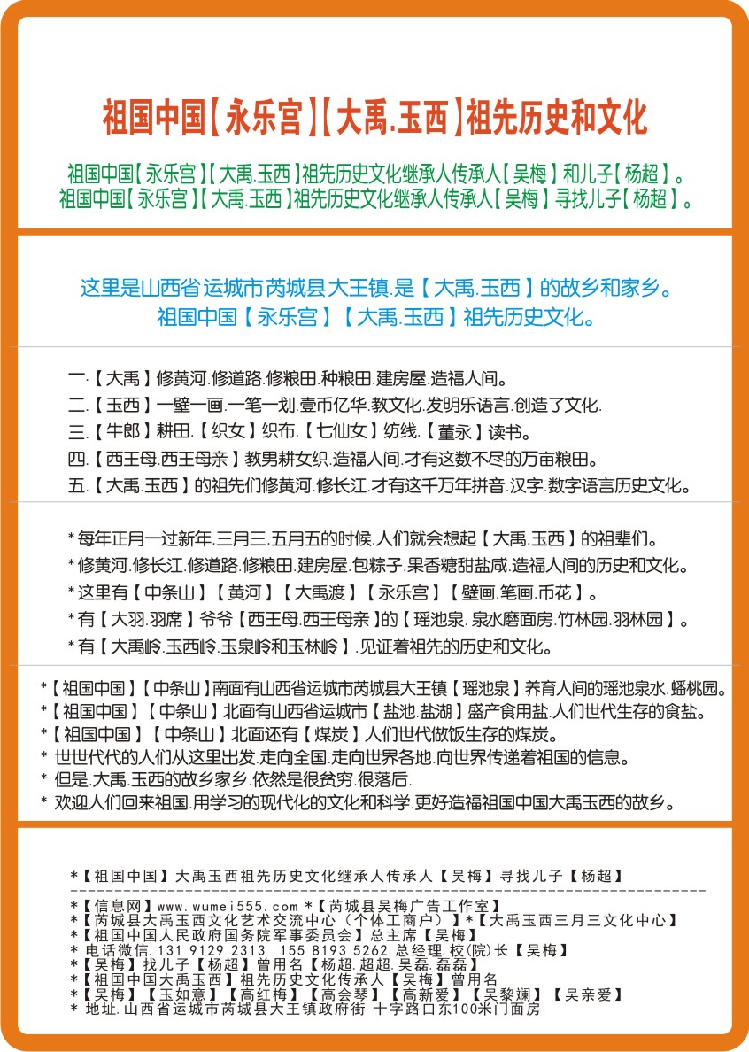 【吴梅】祖国中国【大禹玉西】祖殿祖厅【永乐宫】祖先历史文化传承人【先皇后裔】有芮城县文化局文件。