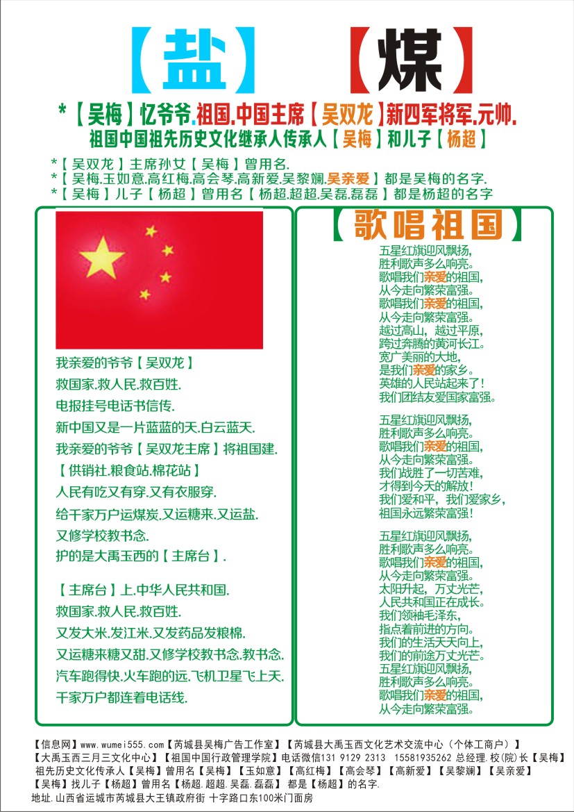 *【吴双龙】总主席孙女【吴梅】总主席管理好吴亲爱的祖国中国【五星红旗.国旗.国徽.党旗.军旗】。