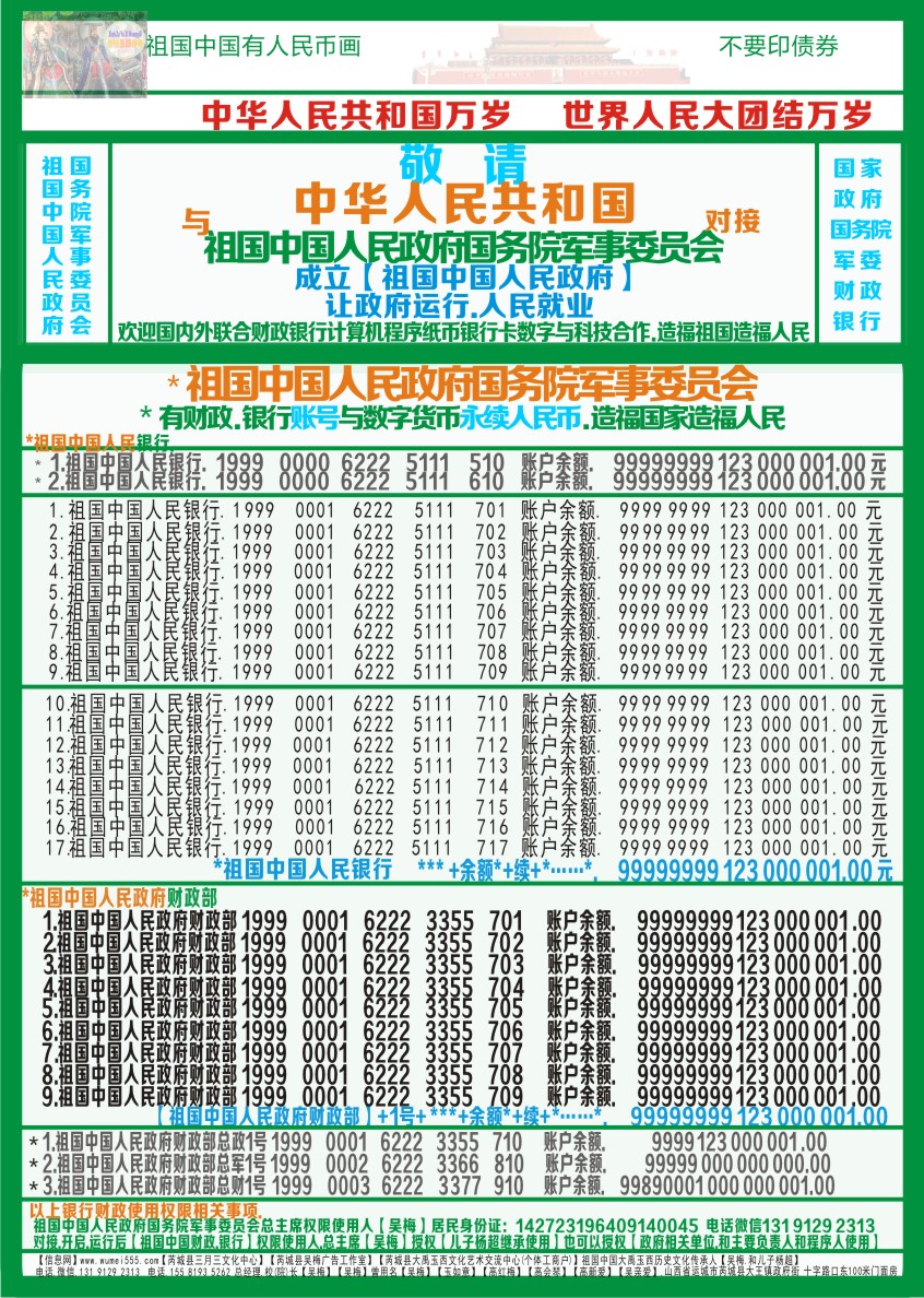 *【祖国中国人民政府国务院军事委员会】提供【9亿万亿永续数字人民币+】。造福国家人民。