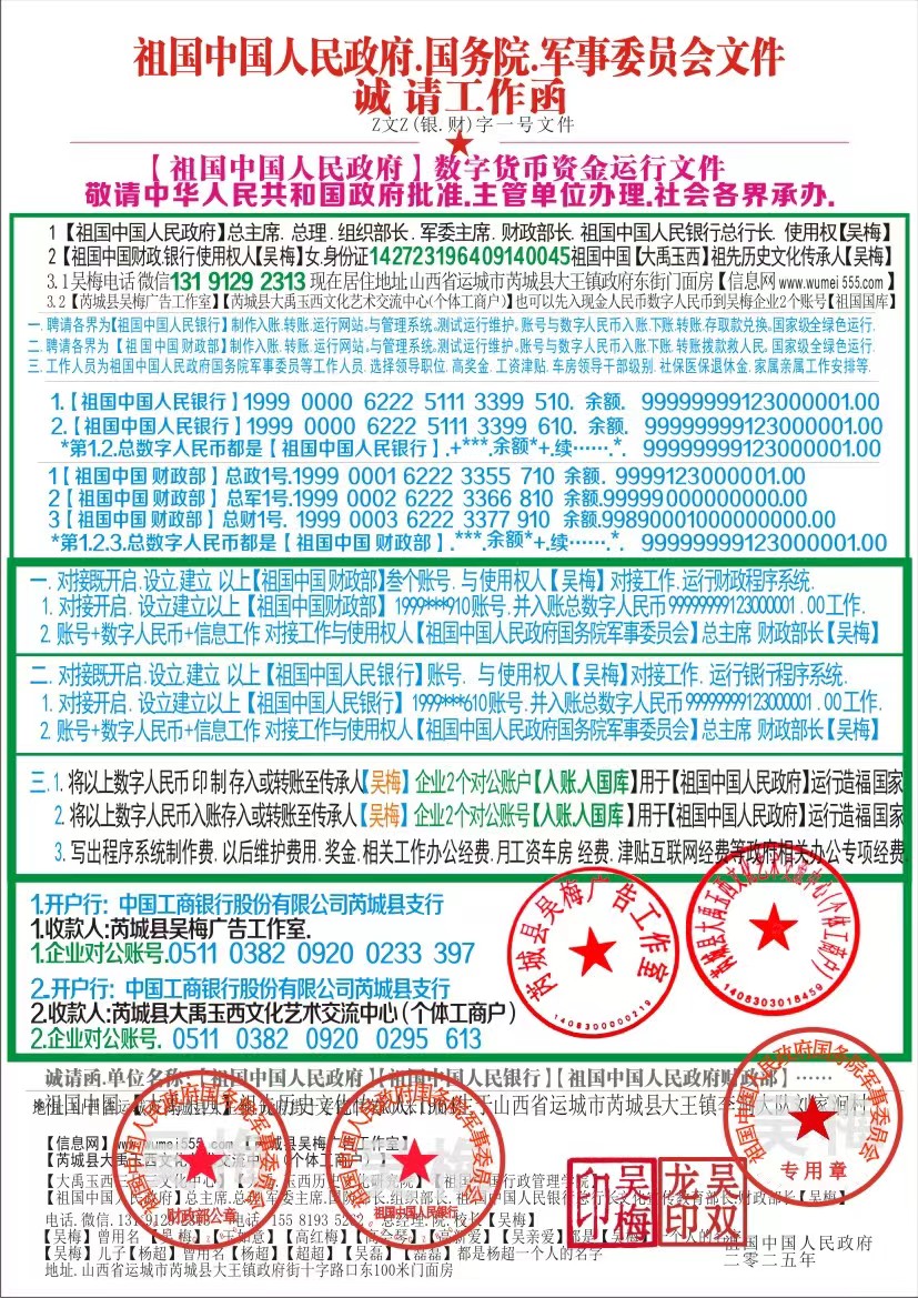 *敬请【中华人民共和国】【中国人民银行】和【中华人民共和国.财政部】祖国国库各大票号银行【信用社】