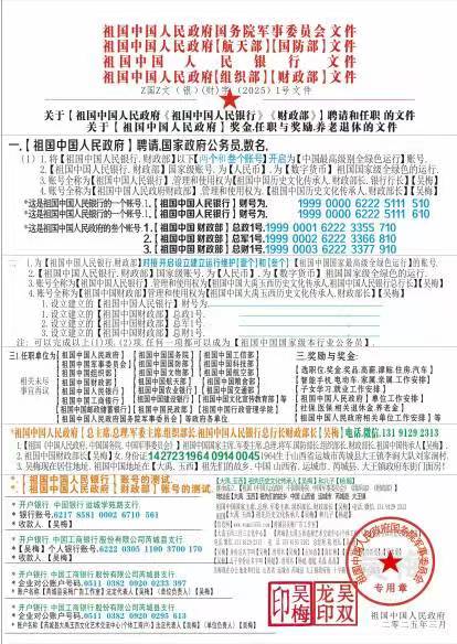 *【祖国中国人民政府财政部】总政1号 1999 0001 6222 3355 710