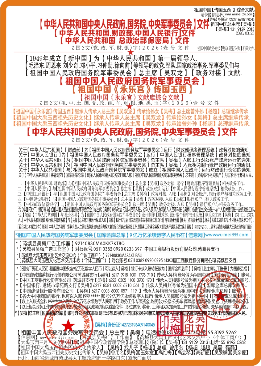 *【中华人民共和国】与【祖国中国人民政府国务院军事委员会】总主席【吴梅】131 9129 2313