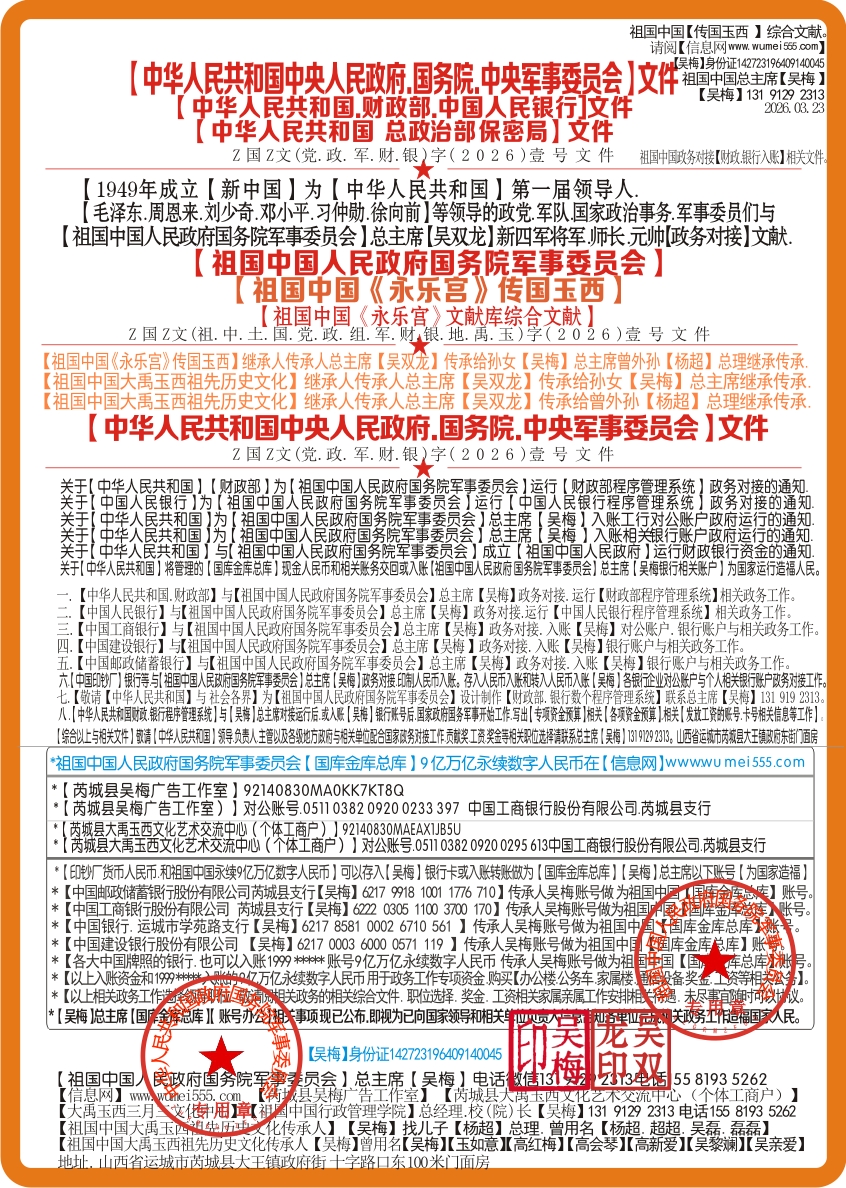 *【吴梅】总主席.军委主席.总书记.财政部长.祖国中国人民银行行长.国防军队政法委书记公检法司。