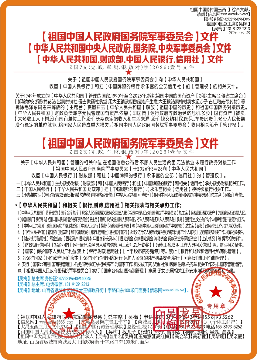 *【祖国中国】总主席【吴双龙】亲自授权孙女【吴梅】总主席等职位.在特殊环境下.